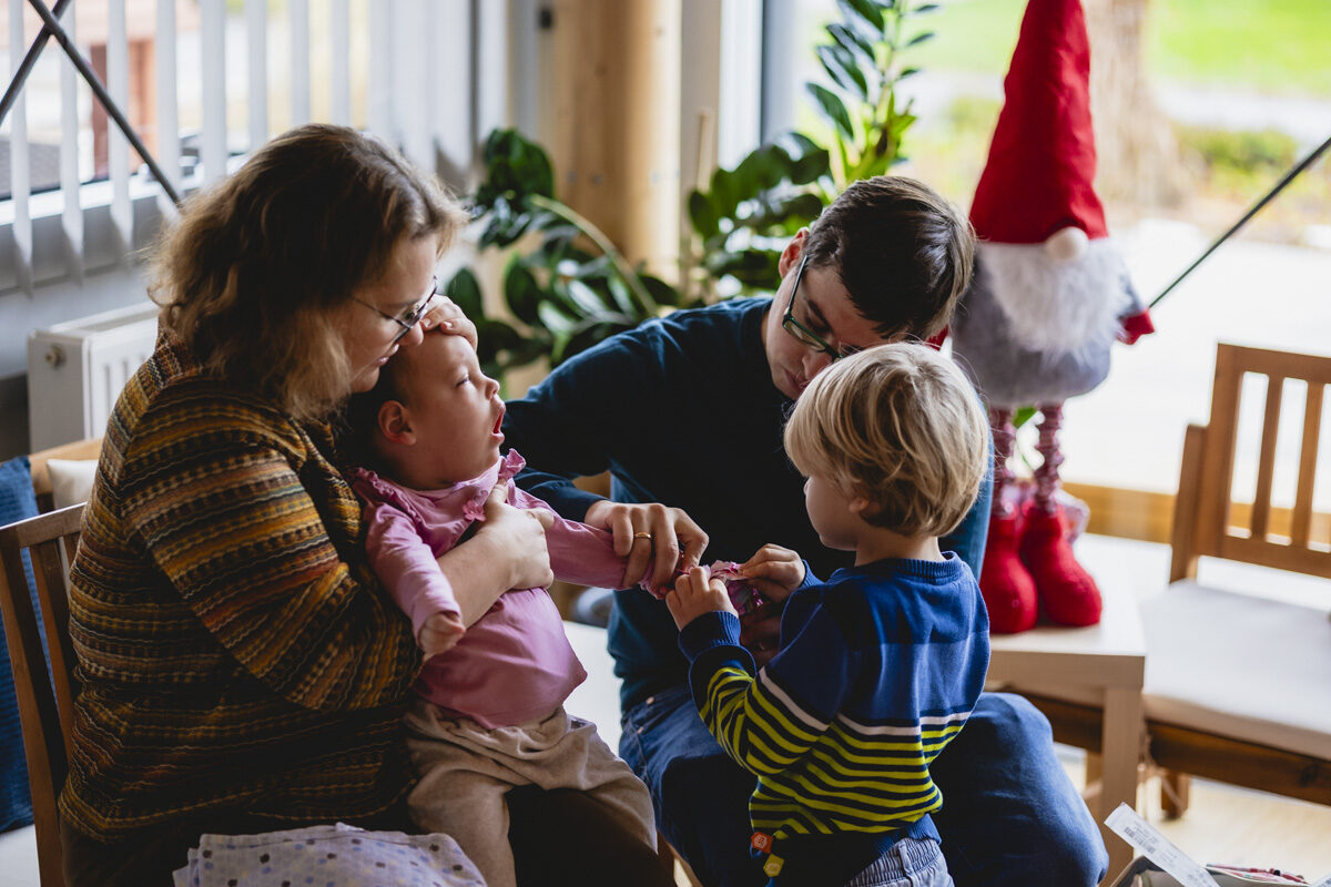 „Allein schon das Auto“, erinnert sich Julia. Es ist ein ganz normales Auto. Aber es ist ganz genau festgelegt, wer wo sitzt und warum. Sarah fährt, Patrick ist Beifahrer, er fährt nicht so gern. Links hinten sitzt Emilia in ihrem Spezialsitz. Patricks Rückenlehne ist weit zurückgestellt, so kommt er leichter an Emilia ran. Und er muss immer wieder an sie rankommen auf der langen Fahrt an den Sterntalerhof, immer wieder röchelt oder hustet sie – dann muss Patrick die Zweijährige absaugen, kein leichtes Unterfangen in einem ganz normalen Auto. Sarah bleibt dafür gar nicht mehr stehen, sonst würden sie wohl nie ankommen und außerdem ist es draußen nass und kalt. Emilias großer Bruder Jakob sitzt rechts neben ihr, blickt aus dem Fenster, sucht beleuchtete Weihnachtsbäume in der Landschaft und zählt ausländische Lastwagen. Wenn Emilia Hilfe braucht, weiß auch er, was zu tun ist. Nur zwei, drei gut geübte Handgriffe – und wieder hat er seinem Papa geholfen, einmal mehr auf der langen Fahrt an den Sterntalerhof. Es ist ein ganz normales Auto. Von außen betrachtet ist es das Auto einer ganz normalen Familie. Wer sieht schon Emilias Spezialsitz. Wer sieht schon die fünf großen Taschen im Kofferraum, alle nur für Emilia. Gerätschaften, Kabel, Pumpen, Tücher, Bänder, Medikamente – und eine Box mit Windeln. Therapeutin und Elementarpädagogin Julia hilft ausladen. Es ist der erste Tag am Sterntalerhof für Familie Wallner. Es ist zwei Wochen vor Weihnachten. Und es ist das erste Mal, dass sie überhaupt irgendwo sind, seit Emilia vor zwei Jahren zur Welt kam, seit sich Sarahs, Patricks und auch Jakobs Leben ganz grundlegend geändert hat.