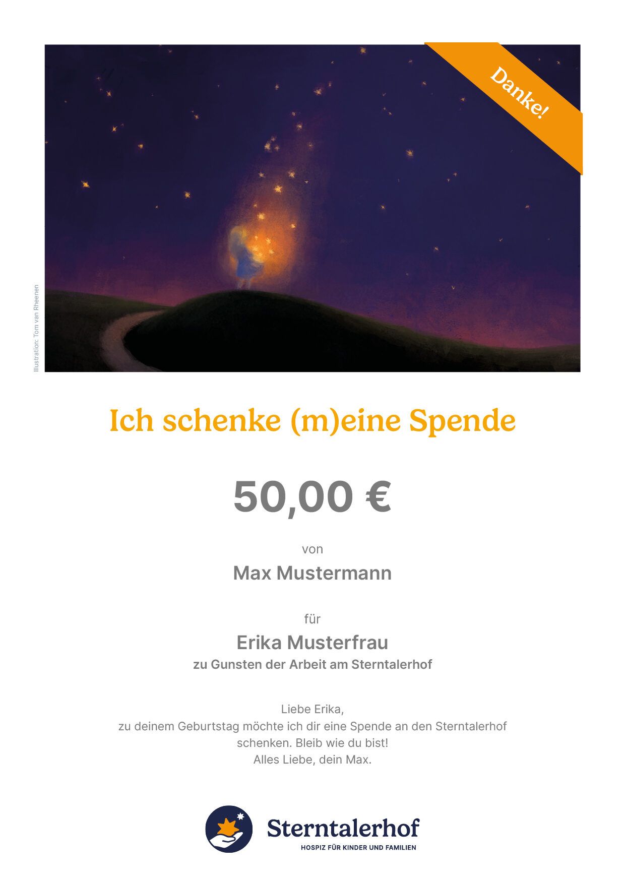 Und so einfach geht’s: Wählen Sie einen Betrag, nennen Sie Schenker*in und Beschenkte*n und verfassen Sie eine persönliche Botschaft (optional). Die fertige Urkunde erhalten Sie nach erfolgreich getätigter Spende als Link zum herunterladen per E-Mail. Ein Geschenk, das von Herzen kommt und Herzen berührt – und das die wertvolle Arbeit am Sterntalerhof erst möglich macht.